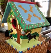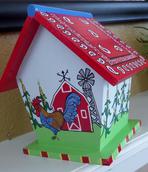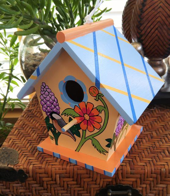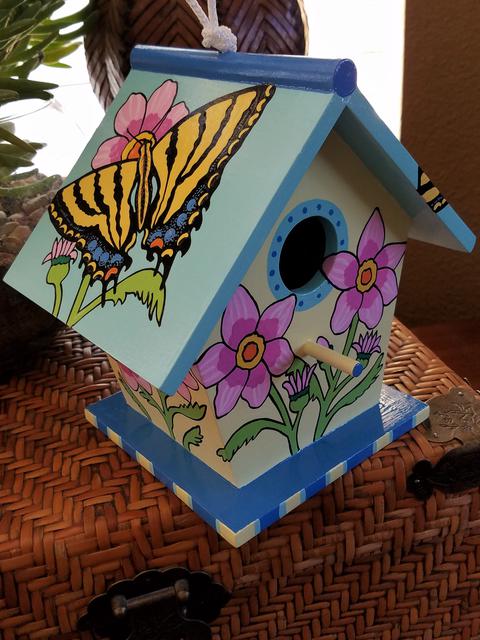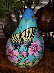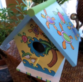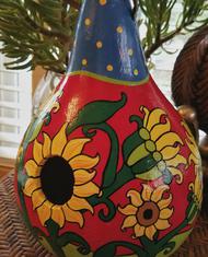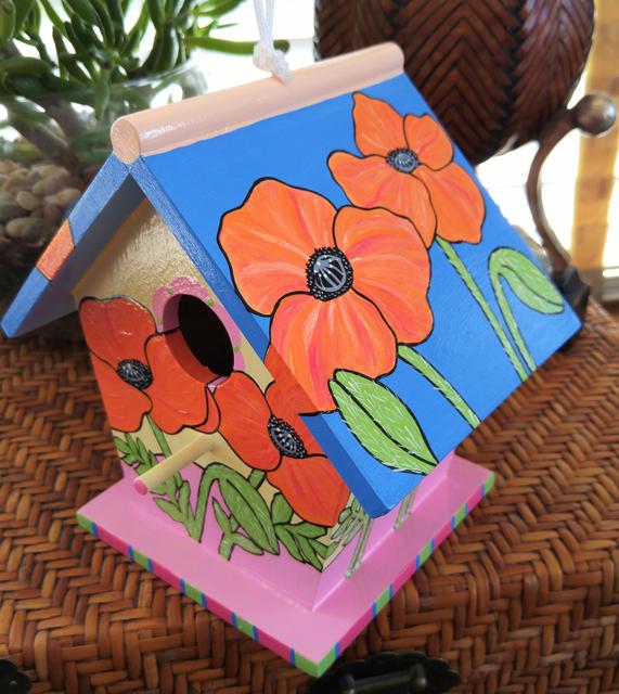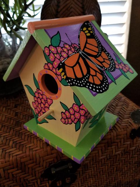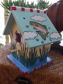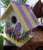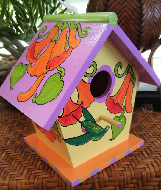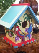 6 x 8 ", hole is 1 1/4" diameter, 4 drain holes in bottom, leather strap for hanging